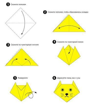 1-ая часть оригами: квадрат, согнутый напополам, но у нас он уже в наличии, так как мы сделали предшествующий шаг. Этот треугольник мы опять складываем напополам, чтоб вышел треугольник еще меньше. Это нужно для очерчивания средней полосы на большом треугольнике. От этой средней полосы нам нужно завернуть два боковых угла в мелкие треугольники. Если положить деталь на стол, она будет походит на цветок из 3-х лепестков. Последний шаг в разработке мордашки кота – загиб верхнего угла детали к двум предшествующим треугольникам. С иной стороны детали можно нарисовать глаза, усы, рот. При складывании оригами можно воспользоваться последующей схемой: