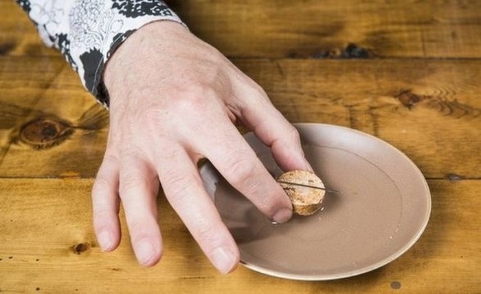 Отрезаем небольшой кусочек плавучего материала. Самое важное, чтобы он был такого размера, чтобы обеспечить плавучесть закрепленной на нем иголки и в то же время, чтобы он имел такой размер, что силы поверхностного натяжения воды и силы сопротивления были пренебрежимо малы — это необходимо, чтобы обеспечить точность показаний.