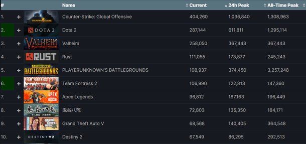 Симулятор выживания Valheim занял третье место по количеству активных игроков в Steam. На момент публикации материала онлайн игры составляет 258 тыс. человек, а пиковое значение за сутки достигло отметки в 367 тыс. человек. Данные предоставлены сервисом SteamDB.