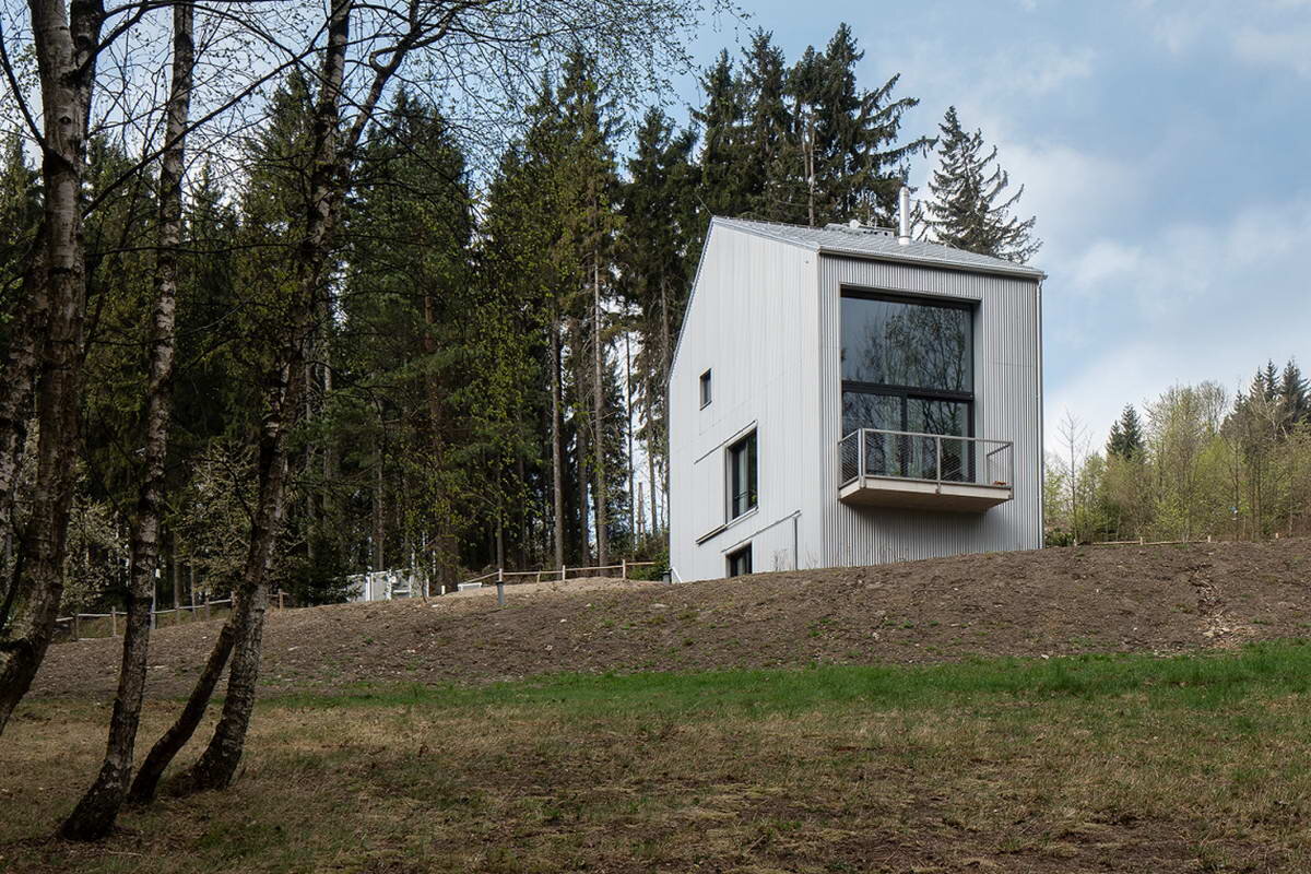 На склоне села Красна в Йизерских горах архитектурная мастерская BARAAK architekti спроектировала дом, интерьер которого благодаря большим застекленным площадям открывается в окружающие леса. При необходимости большие окна можно закрыть раздвижными ставнями и жалюзи. Из-за горных погодных условий весь дом облицован гофрированным металлом, который с боков прорезан высокими окнами на двух этажах. Архитекторы соединили воздушный интерьер вертикально от первого этажа через второй до мансарды, которая задумана как открытая галерея, служащая также тренажерным залом и игровой комнатой для детей.