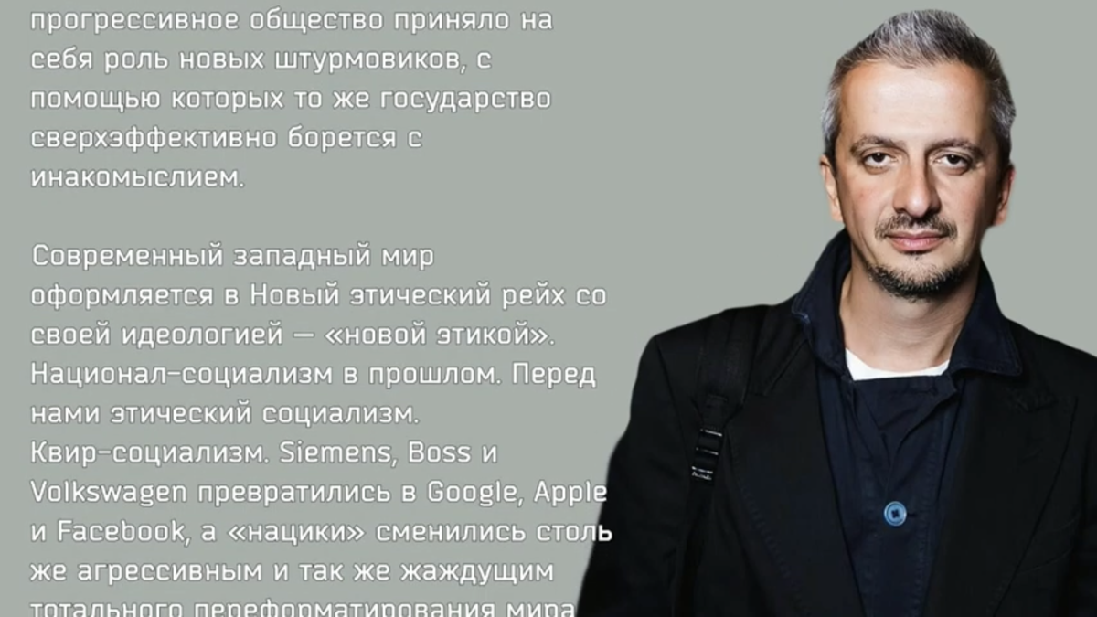 Суть этого нетленного творения, в том что западное общество не терпит инакомыслящих. Какое тонкое и свежее наблюдение. И подвергает их всяческой травле, в том числе и через социальные сети. Богомолов называет западное общество "Новым рейхом", анализирует новые веяния этого рейха, дает определения новым течениям и т.д. В общем беспокоится о судьбе тех, кто против. Это вкратце. С текстом, под музыку и с красивой фотографией автора, можно ознакомится в начале программы.