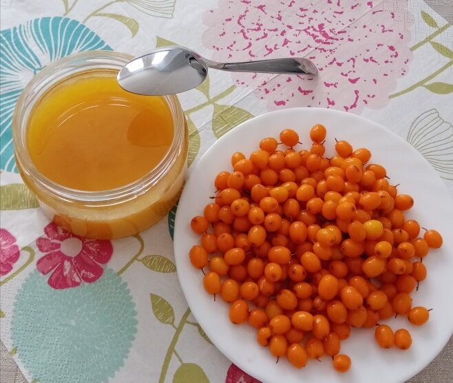 Всем привет, друзья, кто зашел на наш канал и поддерживает нас!!! Сегодня заглянула в морозилку с ягодами и нашла для себя чудеснейшую вещь! Там лежит облепиха. Помню, еще в детстве, мне предлагали ее мама и бабушка, подчеркивая, какая вкусная и полезная ягода , эта облепиха! Я всячески отказывалась и плевалась.... И все же, у них не вышло тогда привить мою любовь к ней. Облепиха отталкивала, своим запахом и вкусом... И вот прошло много лет))) Сейчас и вкусы и пристрастия мои изменились, видимо... Да и "запретный плод сладок", как говорится. Ведь посмотрите, сколько в магазинах, ну или на рынке сейчас стоит облепиха - ужас! Не каждый сможет себе позволить купить за несколько сотен пакет замороженных ягод! Осознавая полезность данной ягоды, я, конечно, старалась покупать ее (хотя бы изредка) в замороженном виде в Ашане. На самом деле, много где читала, что облепиха и мёд имеют ряд целебных свойств против вирусов, инфекционных и других болезней. Кто не имеет аллергии к