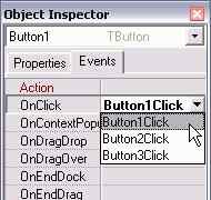 После того, как обработчик создан, на вкладке Events рядом с названием события появится название обработчика для него. Это название также можно вписать и вручную или выбрать из списка, в котором содержатся названия всех обработчиков. Имена обработчикам даются также не случайно: берётся имя объекта и к нему дописывается название события. Например, если есть кнопка Button1 и её событие OnClick, то обработчик получит название Button1Click. Опять-таки, по имени обработчика можно догадаться о событии, к которому он относится.