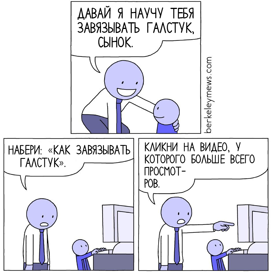 Американский художник Бен Церингер (Ben Zaehringer) рисует простенькие, но очень смешные комиксы под названием Berkeley Mews («Беркли Мьюз»). Довольно часто героями данной серии становятся различные герои популярных книг или кино, но время от времени выходят зарисовки про самых обычных людей. К примеру, первый комикс в этой подборке посвящен трогательному моменту, когда отец учит сына завязывать галстук.