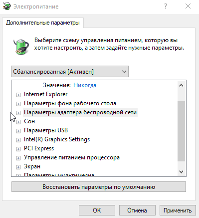 настройка схемы электропитания изменить дополнительные параметры параметры адаптера беспроводной сети ставим максимальная производительность