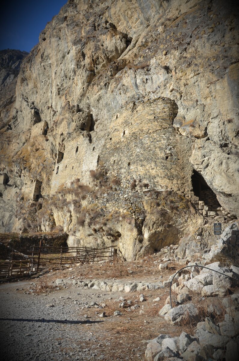 В поселке Дзивгис в Куртатинском ущелье, на левом берегу своенравной реки Фиагдон есть удивительные оборонительные сооружения, датированные 13-16 веками. Но увидеть эти древние замки не так просто, ведь их стены практически сливаются со скалой Кариу-хох и будто растут прямо из нее. Впервые мы познакомились с ними случайно, кода ехали в Даргавс – «город мертвых». Остановились в Дзивгисе набрать воды, любовались отвесными скалами, и мне на мгновение показалось, что на фоне скальной породы проступила каменная кладка, появилась - и тут же пропала. Когда мы подошли к горе ближе, разглядели огромные каменные стены, созданные руками человека. Это уникальное фортификационное сооружение – невидимое и неприступное. Когда-то через поселок проходил один из главных торговых путей, ведущих в Закавказье. Можно сказать, что это была третья по значимости дорога после Военно-Грузинской и Военно-Осетинской. Путь проходил по очень узкому ущелью, а великолепный обзор на него со скалы Кариу-хох не оставлял врагам не единого шанса.
