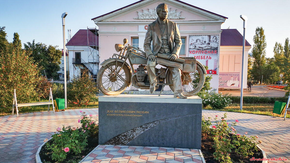 На обратной дороге из Крыма мы остановились на ночлег в городке Калач, Воронежской области. Наутро с восходом солнца отправились дальше ... правда я чуть чуть плутанул в поисках магазина и спросил дорогу у местного жителя ... Он мне и ответил: "Езжай по этой улице прямо, до "мужика с мотоциклом" и потом направо ..." Мне стало интересно, что это за "мужик с мотоциклом". И действительно, через пару