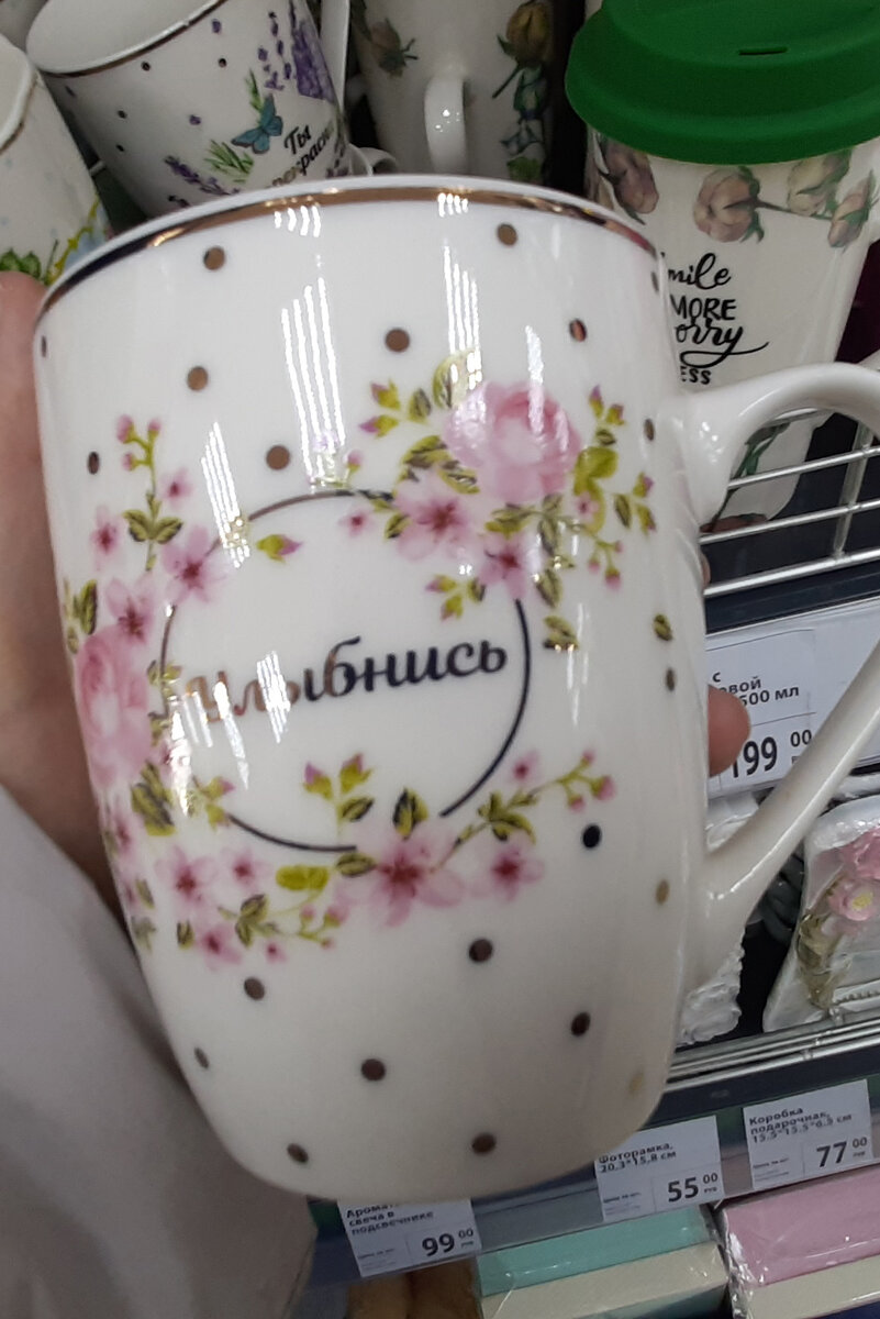 Привезли милые чашки с позитивными надписями. Такую приятно будет получить с подарок!