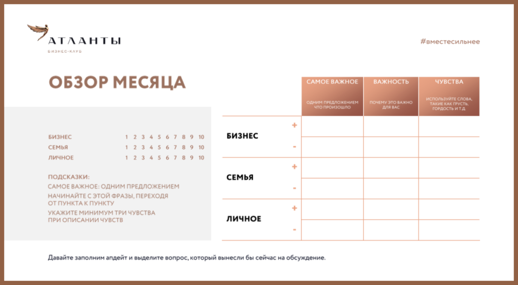 1. Раз в месяц участники группы собираются и рассказывают друг другу о том, что у них произошло за месяц в бизнесе, семье и отношениях с собой.