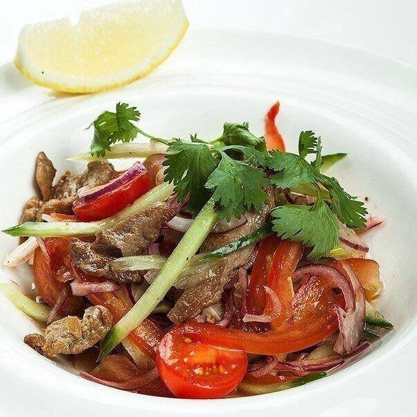Ингредиенты:Отварная говядина - 100 грСредний болгарский перец - 1 штСредний огурец - 1 штСредний помидор - 1 штЗелень и чеснок по вкусуОливковое масло - 1 ст.лСоевого соуса - 2 ст.лПриготовление:🔺Овощи и мясо нарезать соломкой, чеснок мелким кубиком, зелень нашинковать.🔺Заправить смесью масла и соевого соуса.