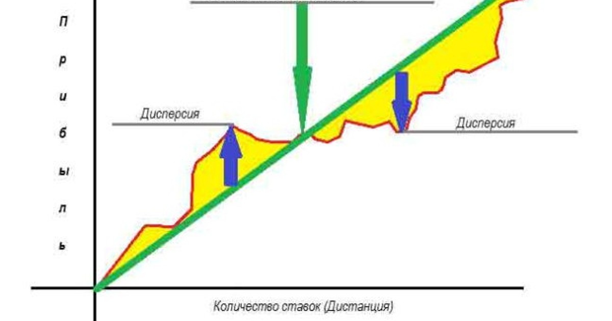 - Дисперсия — математический термин, который означает отклонение от математического ожидания. При малом количестве испытаний (или, как мы выше говорили, «дистанции») дисперсия может быть очень большой, что искажает истинную картину, при большем количестве испытаний дисперсия уменьшается.