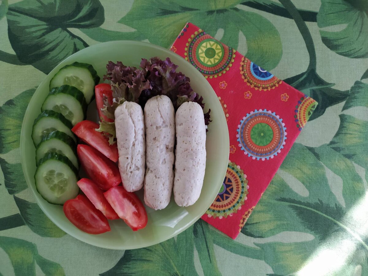 На обед вместо бифштекса (по своему опыту знаю, как жаренное мясо быстро надоедает) сделала так называемые домашние сосиски из филе индейки. Рецепт напишу в конце поста, что бы не забылся. По сути, это вареное мясо со специями.... С кетчупом было бы вкуснее... Зато еще порция на следующую неделю осталась )) У меня сосисок было три штуки весом 150 гр - это 230 ккал, плюс половина огурца -33 ккал и половина небольшой помидорки - 20 ккал. Итого 283 ккал.