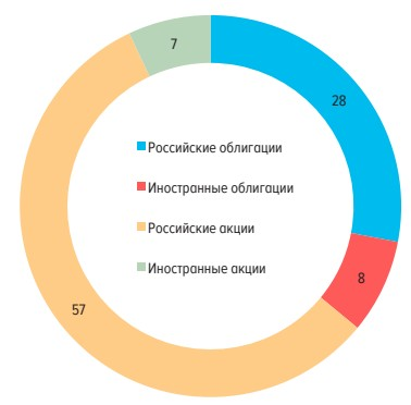 ⭕ Круговая диаграмма показывает актуальную структуру инвестиций Россиян на 1 января 2021 г. Российские акции (57%) и облигации (28%) -