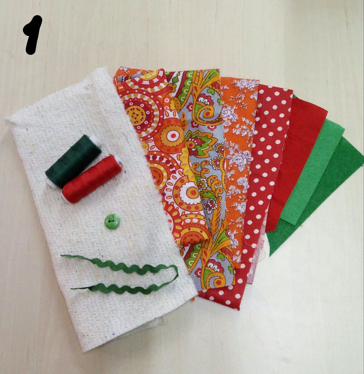 Для работы нам понадобятся: ткани ситцевые красных и оранжевых оттенков (можно лоскуты), красная однотонная ситцевая ткань, тонкий стеганый ватин, зеленый шнурок или волнистая тесьма, зеленый фетр двух оттенков, нитки швейные красные и зеленые, зеленая пуговица.