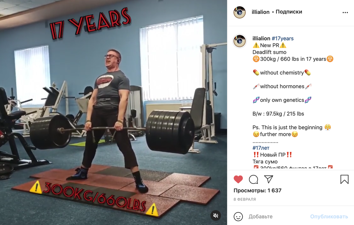 В прошлый раз Илюха сделал 270кг на камеру и спустя всего три месяца его рекорд уже 300кг. Такой прогресс по словам парня у него благодаря генетике, возрасту и 100%-му фокусу на одном упражнении.