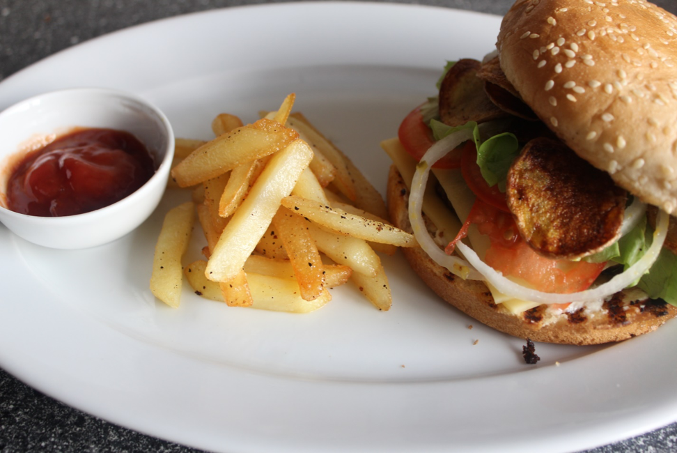 - Соединим две половинки. Дополним блюдо картофелем фри и соусом.
