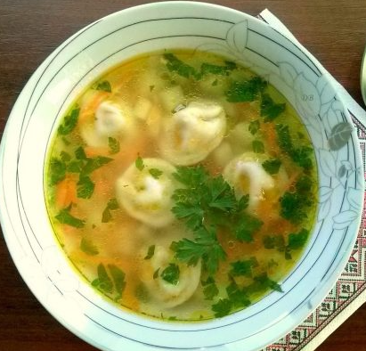 5. В кастрюлю налить бульон. Довести до кипения. Добавить картофель и готовить до полуготовности. Теперь опустить в кастрюлю ленивые пельмени, готовить до готовности. В самом конце добавить поджарку из моркови и лука, лавровый лист, перец горошком, готовить 2 минуты. Готовый суп посыпать укропом. Подавать со сметаной.