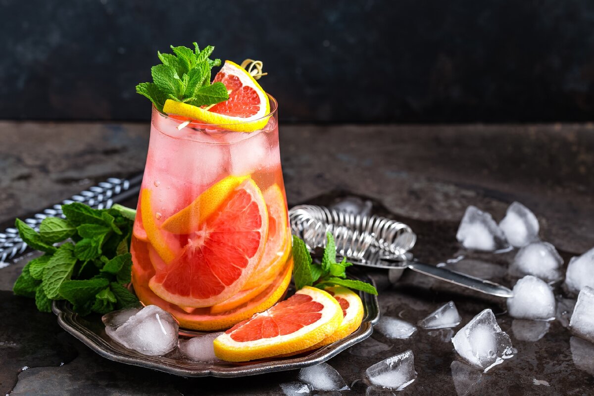 1. Наполни бокал кубиками льда доверху, среди кубиков льда поместите дольки грейпфрута