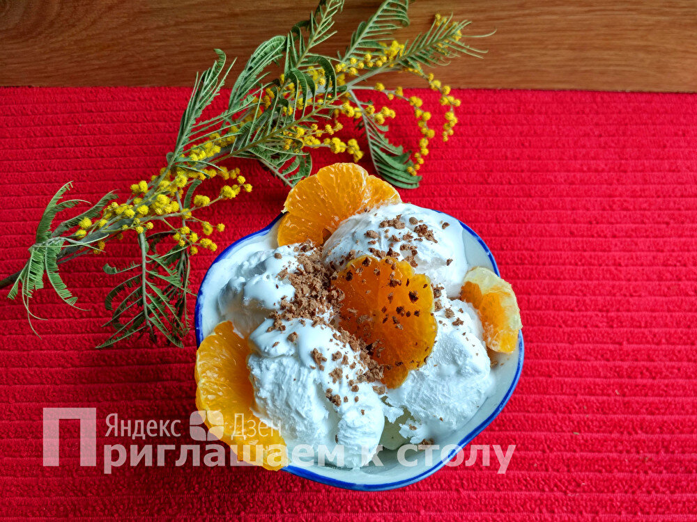 Готовое лакомство достаем из морозилки. Не снимая крышки, даем ему минут 5 постоять при комнатной температуре, а потом делаем шарики и раскладываем их по креманкам. Можно посыпать шоколадной крошкой и украсить ломтиками мандаринов.