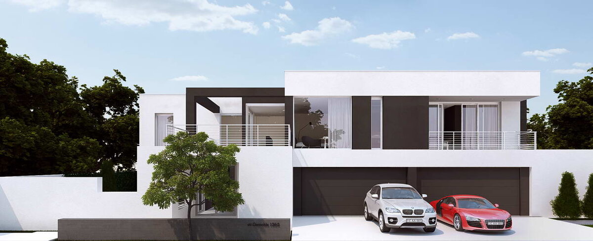 Основная концепция проекта основана на главном увлечении его владельца – автомобили. Пространство дома минималистично и сдержано как в архитектуре, так и в цвете. И в интерьере, и в экстерьере доминирующий цвет — белый, который подчеркивается черными контрастами.