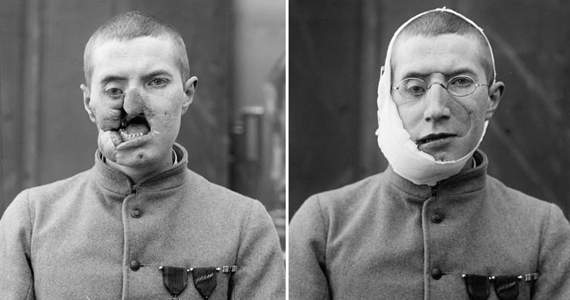 Британский хирург Фредерик Элби, работавший на передовой, был изумлен, что солдаты «не понимают угрозы пулеметов». В итоге в одной только британской армии насчитывалось 60 тысяч человек, получивших ранение в лицо (это попадание пули, чаще всего в глаз, и осколков гранат и снарядов). А во Франции был даже специальный ветеранский союз для людей с поврежденными лицами, в котором насчитывалось 9900 членов.