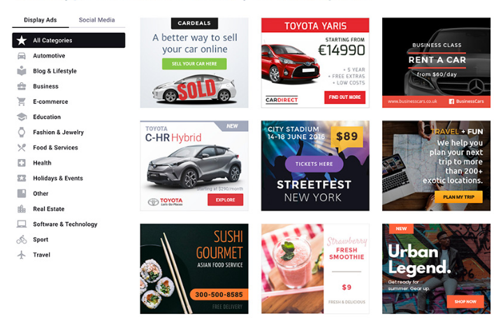 Шаблоны Bannersnack охватывают широкий спектр рекламных баннеров и постов в социальных сетях.