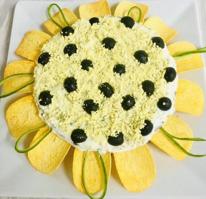 🔹Украшаем половинками чёрных оливок и чипсами как показано на фото.