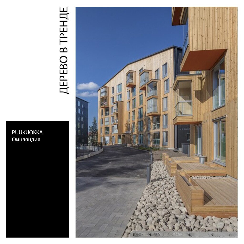 Опыт высотного строительства из дерева в Финляндии насчитывает уже более 5 лет. В 2015 году было построено первое высотное – 8-ми этажное здание из дерева в комплексе Puukuokka Housing Block (г. Ювяскюля, Центральная Финляндия). Комплекс состоит из 3 домов: 6-ти этажный дом был сдан в эксплуатацию 2017 году и еще один 8-ми этажный - в 2018.