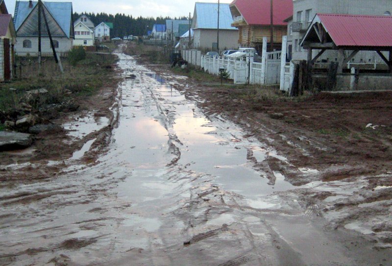 Цивилизация дошла лишь до основных дорог посёлка. Мы же, окраина, довольствуемся грязью по колено. А местами по уши. Мытьё сапог и крыльца после каждого выхода из дома