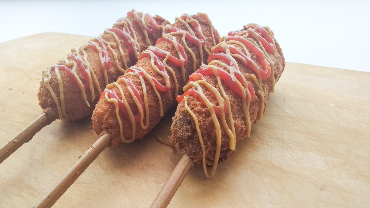 Жарим в масле, на среднем огне (160-170°C), до золотистого, золотисто-коричневого цвета, в течении 1-2 минут. Сверху (по желанию) корн-чиз-доги можно украсить кетчупом и горчицей.
