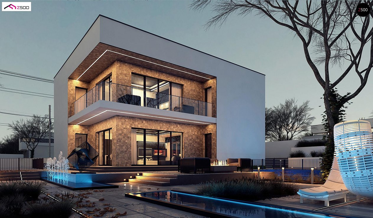 - Дом, несмотря на простую форму благодаря грамотному и интересному дизайну экстерьера смотрится респектабельно, дорого и стильно.