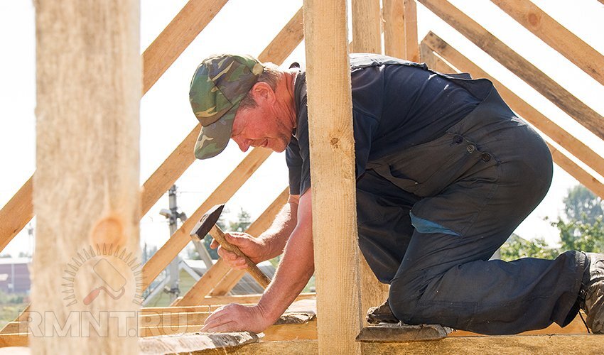 Затем нашиваем сплошным рядом обработанную необрезную доску (как обработать — см. «Фальш-пол» в 1 части ) и, при необходимости, контр-обрешётку (рейка 20х40).