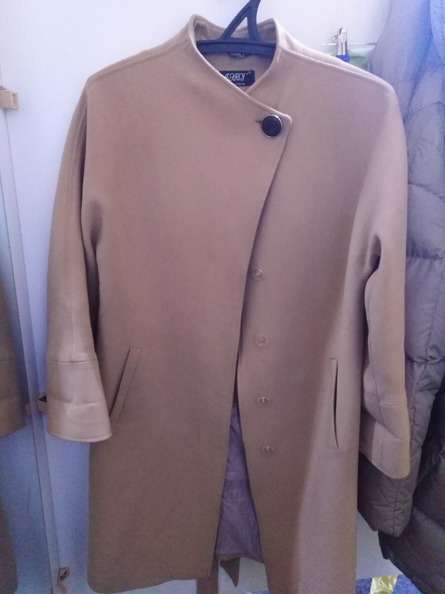 Фасон прямой, с пояском, модель под "кимоно". Застегивается на одну большую пуговицу, остальные потайные. Цвет бежевый. Цена 750р. Ярлыка с составом не было. В интернете стоимость пальто этого производителя от восьми тысяч, в составе которых имеются шерсть 80%.