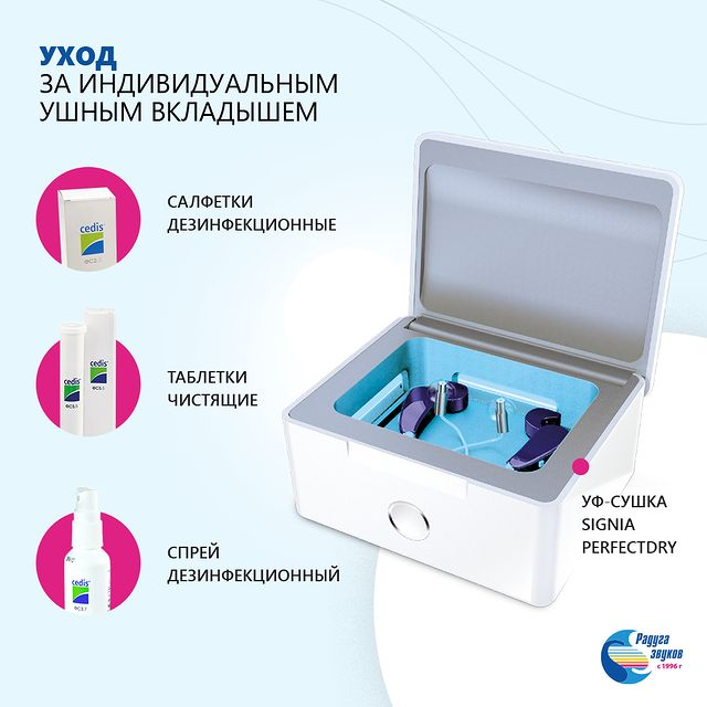 • Высушить вкладыш, а также слуховой аппарат можно в электрической УФ-сушке