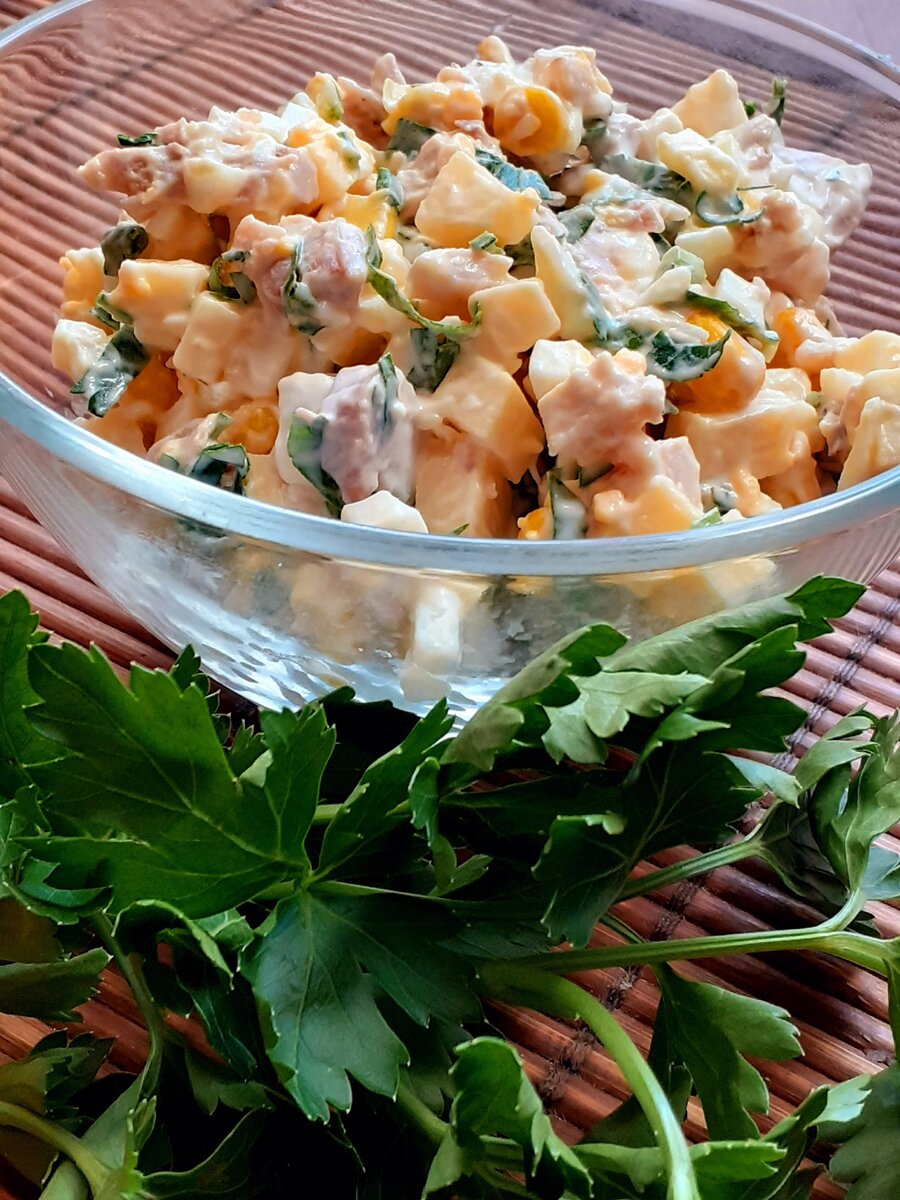 Вообще люблю салаты с кукурузой и сыром, поэтому всегда пробую что-то новое для себя. Домашние оценили салат и я хочу поделится этим простым-простым рецептом с вами. Итак, по порядку: