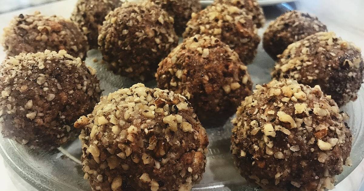 - Фрукты соедините со взбитой массой и охладите. Из охлажденной смеси сформуйте шарики, обваляйте их в толченых орехах и уложите на блюдо.