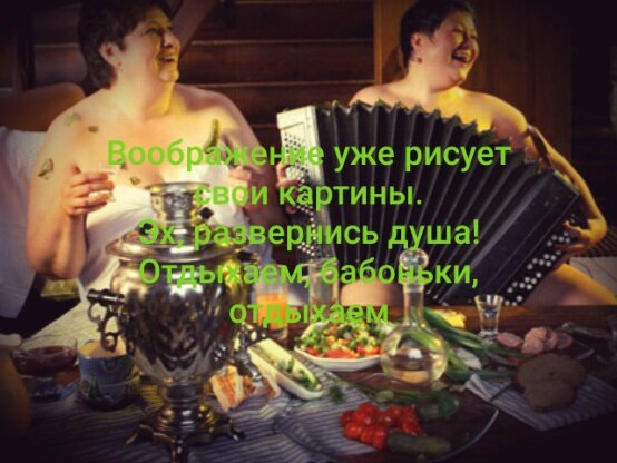 -Да ну их всех в баню! - заорала Танюха. - Вы бы ещё Павлика Морозова вспомнили. Мы в баню пришли или про всякую чепуху разговаривать? Наш праздник, и точка! Выпьем за нас, бабы! А 8 вот я лично ничего делать не буду, только отдыхать. И вам советую. А убраться и приготовить сразу побольше завтра планирую. Феминистки мы в конце-концов или нет!