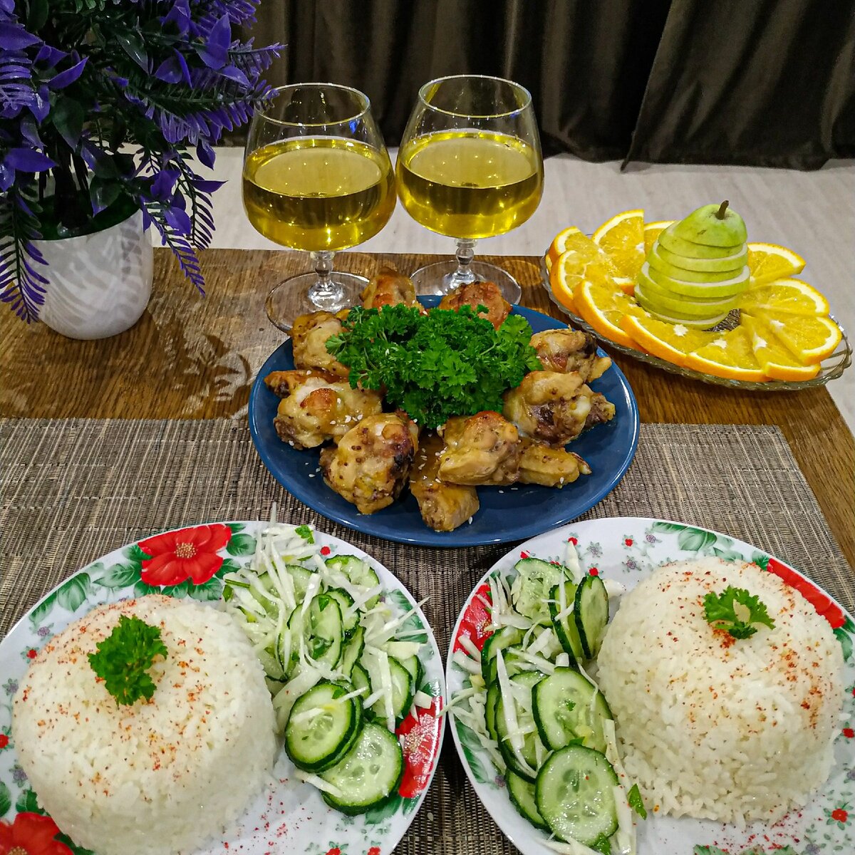 В этот раз у нас отварной рис, простенький салатик, и крылышки.