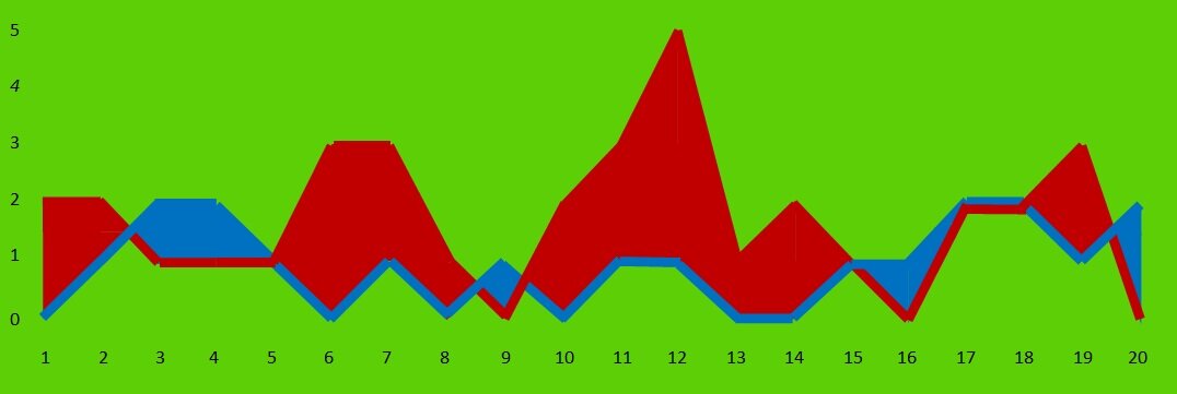 Посмотрим на график выступления ЦСКА. По горизонтали расположены цифры с номерами туров. По вертикали - голы. Красный цвет отображает сколько мячей забил ЦСКА в матче указанного тура, синий - сколько пропустил.