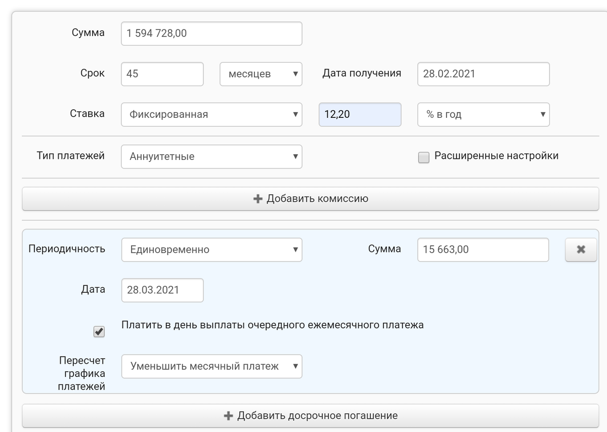 Добавляю в дату основного платежа такое досрочное погашение, и ежемесячный платеж на апрель становится 43857: