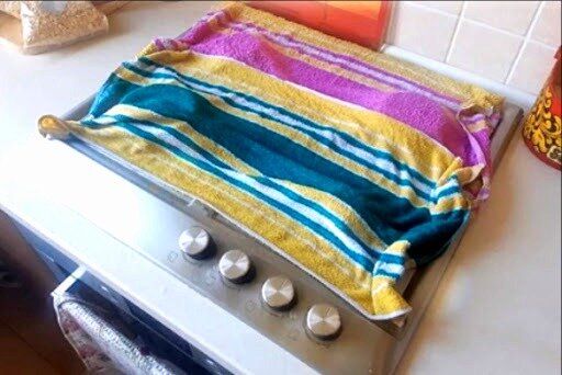 Заглянув на кухню, обнаружила нечто необычное и столь знакомое - плита укутана полотенцем. И тут воспоминания из детства напомнили мне, откуда я это уже видела. Но зачем это все? Спросила и получила ответ - таким образом отлично отмывается весь жир и нагар. Причем нужно гораздо меньше усилий, чем пытаться насухую отодрить щеткой и губкой.