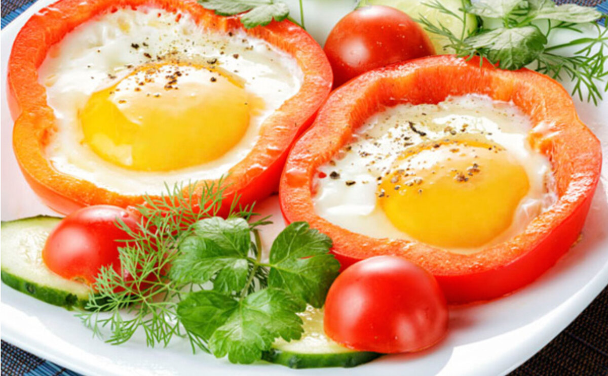 Сковороду разогрела и смазывала растительным маслом. Выложила кольца перца, в каждое кольцо по пластинке томата и разбила туда по одному яйцу.