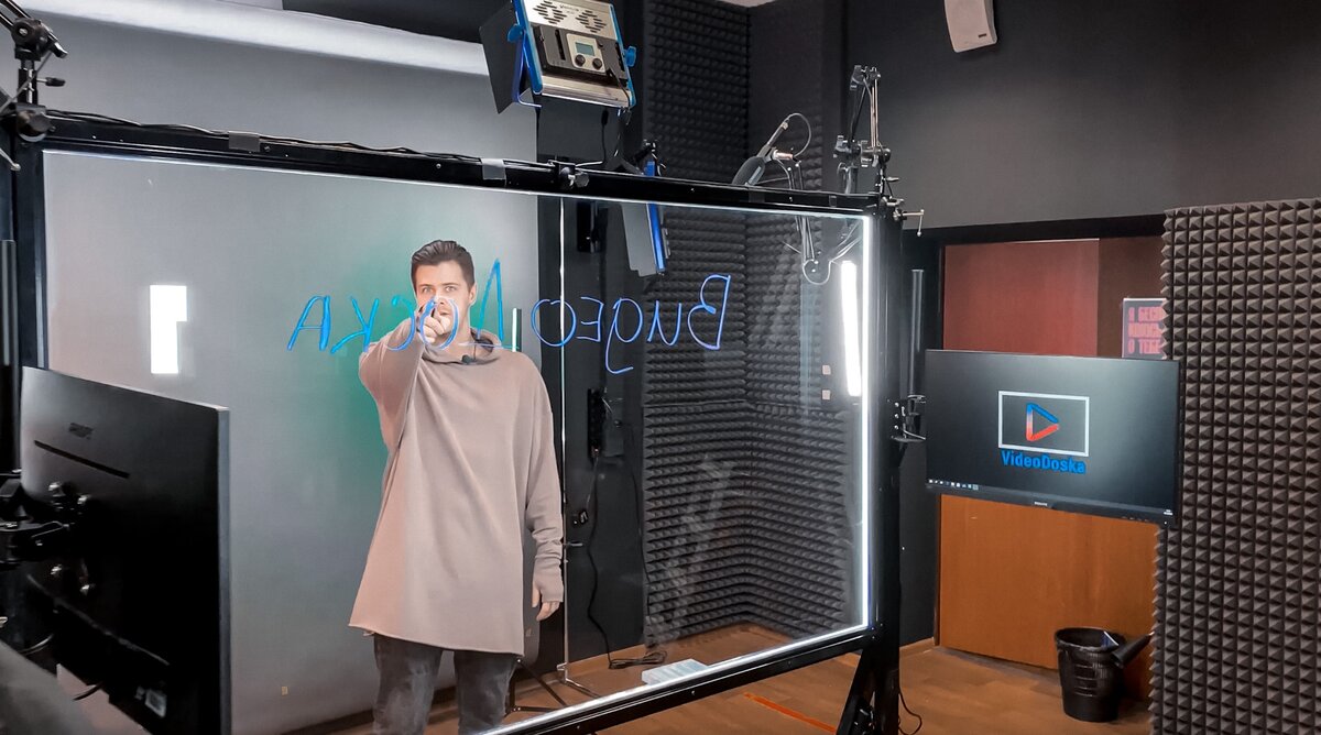 Главным объектом студии является Видео Доска, которая оснащена двумя микрофонами Sennheiser для качественного и объемного звука.