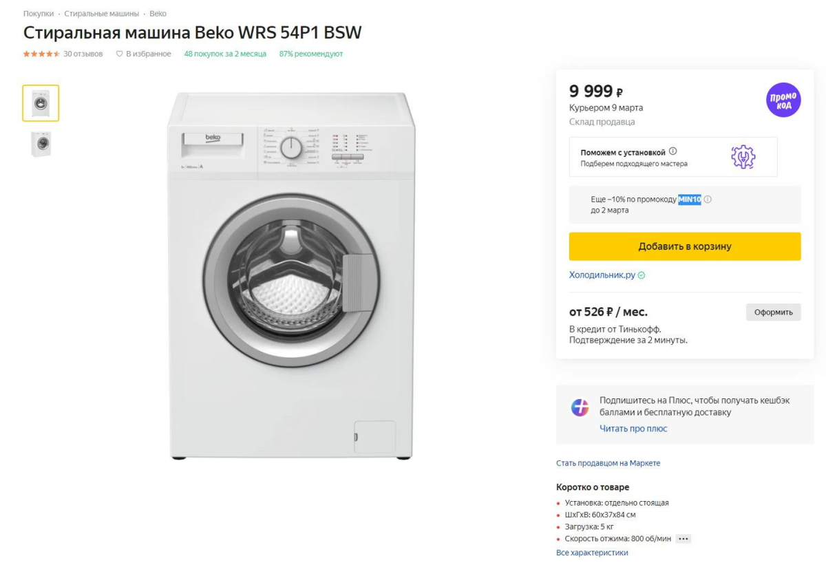 🔥Стиральная машина узкая Beko WRS 54P1 BSW за 8999₽ ( ̶9̶9̶9̶9̶₽̶) на Яндекс.Маркете.