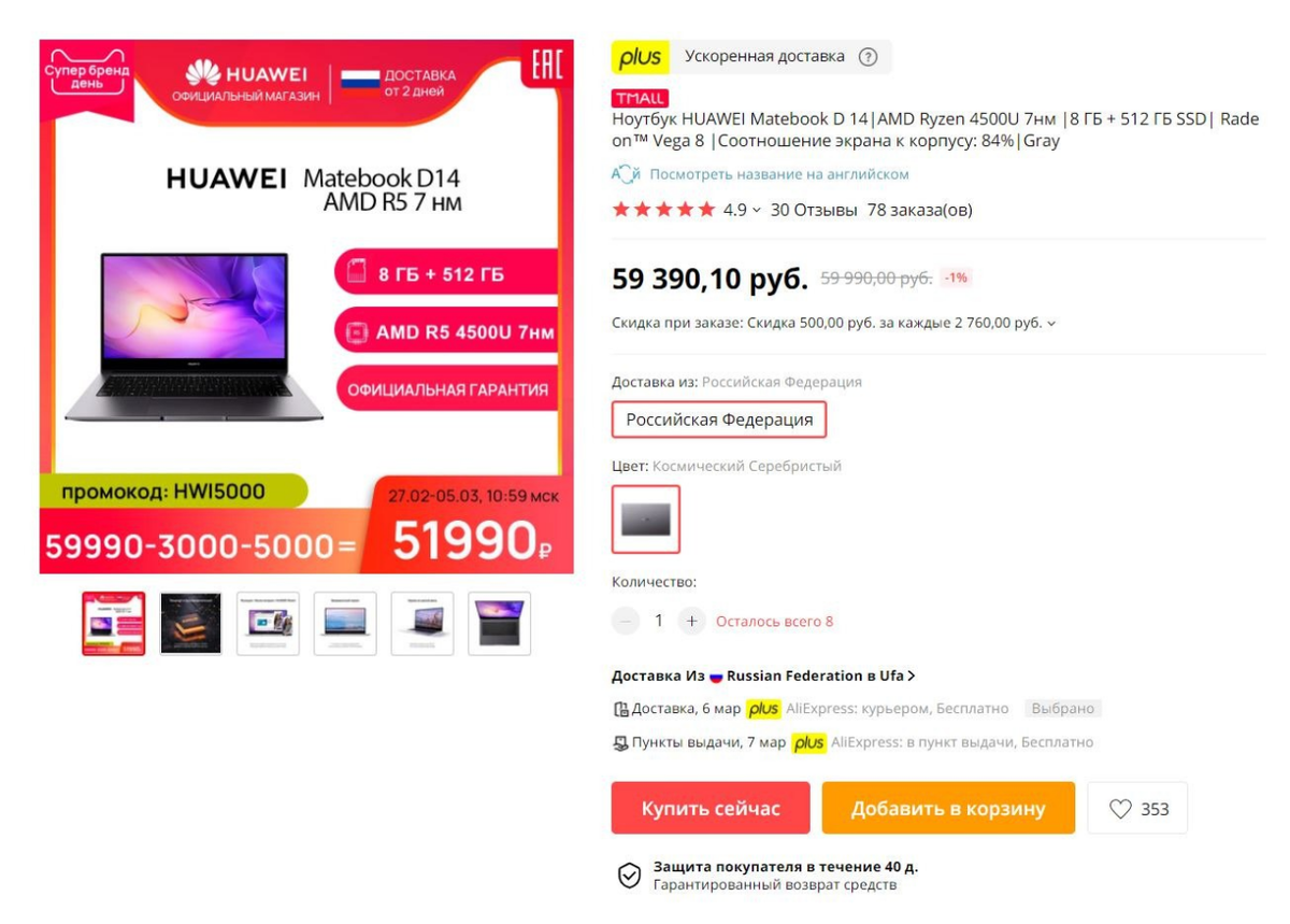 🔥Ноутбук 14" HUAWEI MateBook D14 за 51990₽ ( ̶5̶9̶3̶9̶0̶₽̶) на Али Тмолл.