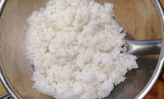 Первым делом, надо поставить варить рис и яйца. Когда рис сварится, промыть его под проточной холодной водой.
