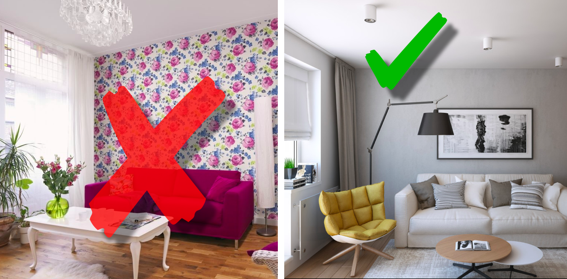 Обои создают ритм своим рисунком, что искажает ощущение пространства.