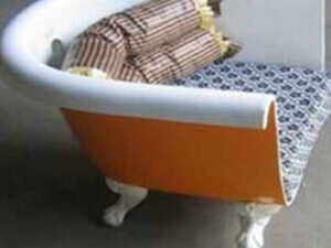 Ну и напоследок, из старой чугунной ванны можно сделать красивое кресло для дачи. Также как и в случае с камином, достаточно разрезать ванну напополам. После этого приспособить ножки к её днищу, и сделать удобное сиденье из поролона, которое обтягивается прочной тканью.