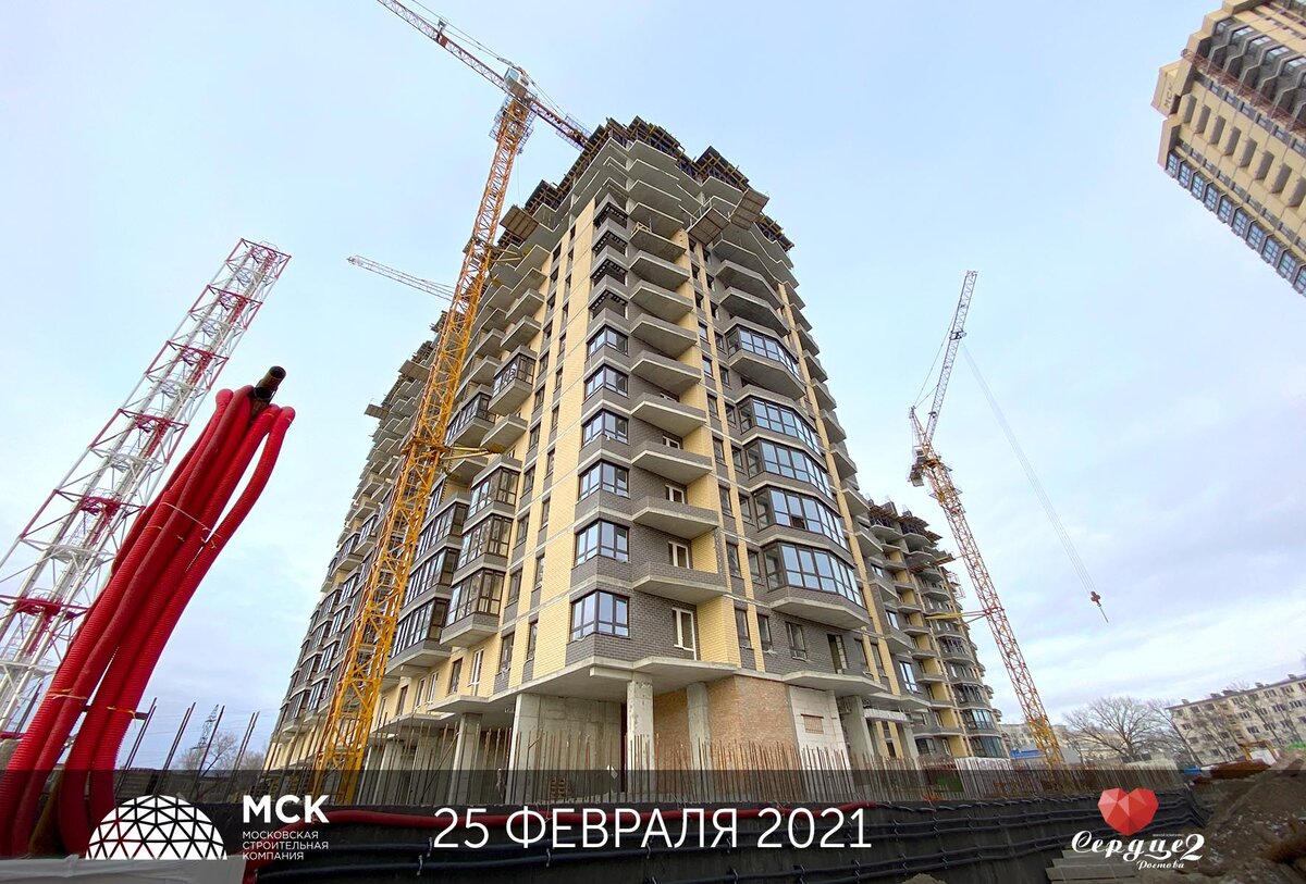 В Литере 7 ЖК «Сердце Ростова 2» на 25 февраля активно возводятся вертикальные конструкции 17 этажа, на 85% завершено устройство плиты перекрытия 16 этажа. Работы по устройству вертикальных конструкций -1 этажа 3-х частей пристроенной автопарковки выполнено на 90%. Устройство вертикальных конструкций на 1 этаже паркинга реализовано на 10%. Продолжается установка систем отопления и вентиляции, водоснабжения и канализации, проводка электрических сетей и слаботочных систем.