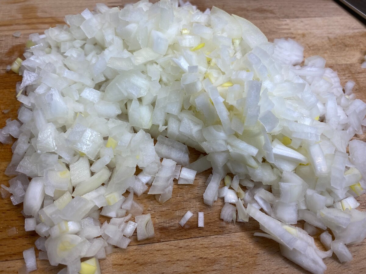Первым делом возьмем лук, почистим его и нарежем кубиком.